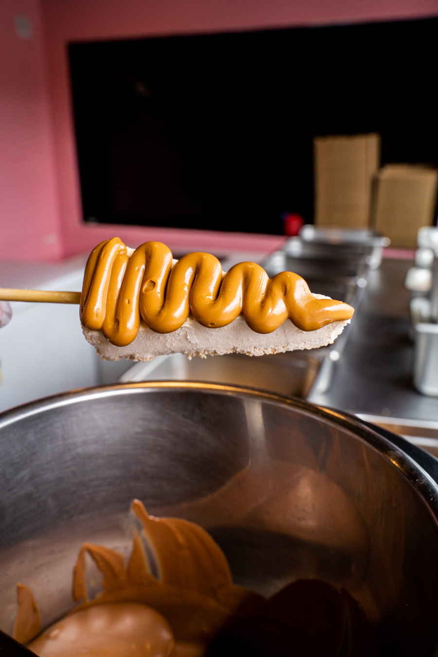 Fluffy Dutch Poffertjes with Pistachio chocolate, white chocolate & crushed pistachios.